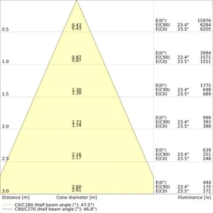 Der Abstrahlwinkel bezeichnet den Winkel, in dem das Licht aus der Lichtquelle ausgestrahlt wird. Er wird in Grad (D) angegeben. Je geringer die Gradzahl des Abstrahlwinkels ist, desto kleiner ist auch der Durchmesser des Lichtkegels, den die Lichtquelle produziert.