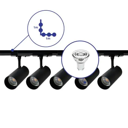 Description Ensemble complet Rail Monophasé Rail L 1 x 1 Mètre Noir | incl. 5x Spot + GU10 2700K 3W Dimmable + Embout, Connecteur d’Alimentation et L -Connecteur