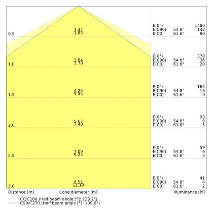 Le code couleur se compose de l'indice de rendu des couleurs (IRC) et de la température de couleur (Kelvin). Le premier chiffre indique le rendu des couleurs (1 = très mauvais rendu des couleurs, 9 = meilleure authenticité des couleurs). Le deuxième et troisième chiffre indiquent la température de la couleur. Exemple : Le code couleur "830" indique que la lampe a un bon rendu des couleurs (8) et une couleur de lumière blanche chaude (30 = 3000K). |
